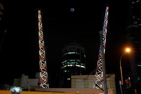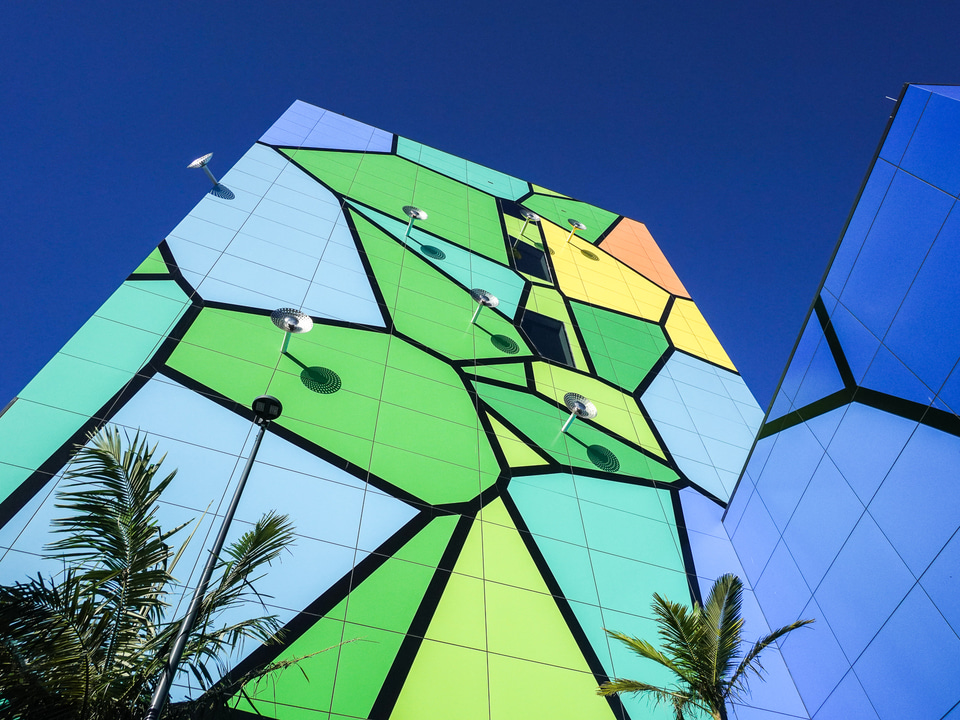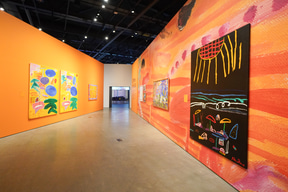 ゴールドコーストの美術館「HOTA(Home Of the Arts)」。遠目からでもよく分かるカラフルな建物 オーストラリアの画家Imants Tillersの作品 Bridget Rileyの70年代の現代アート作品 左にマティス(Henri Matisse)、正面はLong Tom Tjapanangkaというオーストラリア人画家のウルル(エアーズロック)の作品が見える 日本でも有名なオーストラリアのアーティスト、ケン・ドーン(Ken Done)の企画展がちょうど開催されていた HOTAコレクションは約4500点も収蔵されている 右上のHOTAのコレクションブックを記念に購入してみた 上階には「エキシビショニスト(exhibitionist)」というバーがあり、オープントップテラスもある