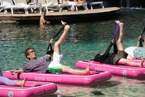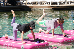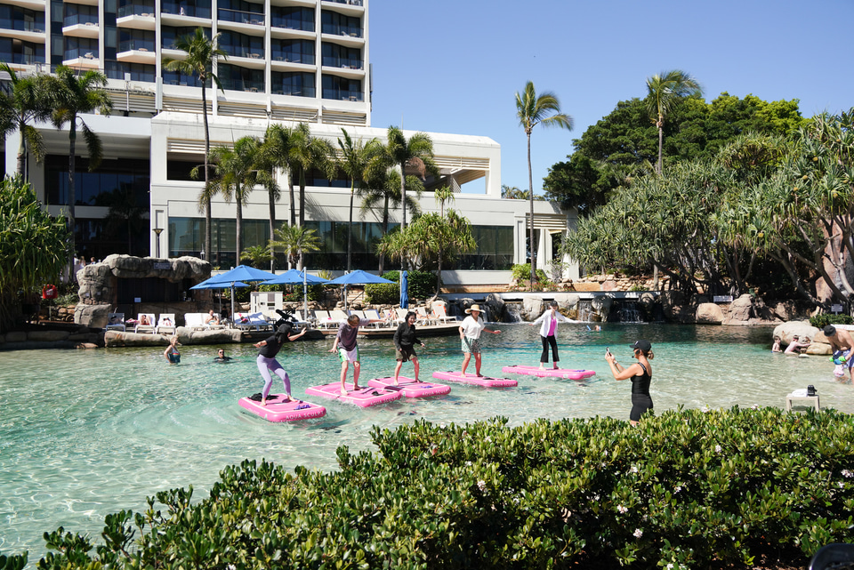 ホテル前ラグーンの水上で「アクア・スカルプ・ピラティス」も体験 水に浮かせたエアマットの上なのでバランスをとるのが難しい 人気動物園でコアラやカンガルーなどの野生動物と間近に触れあう