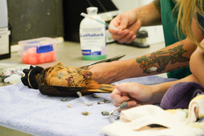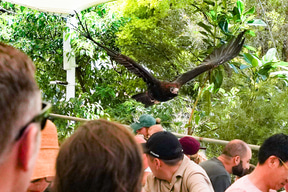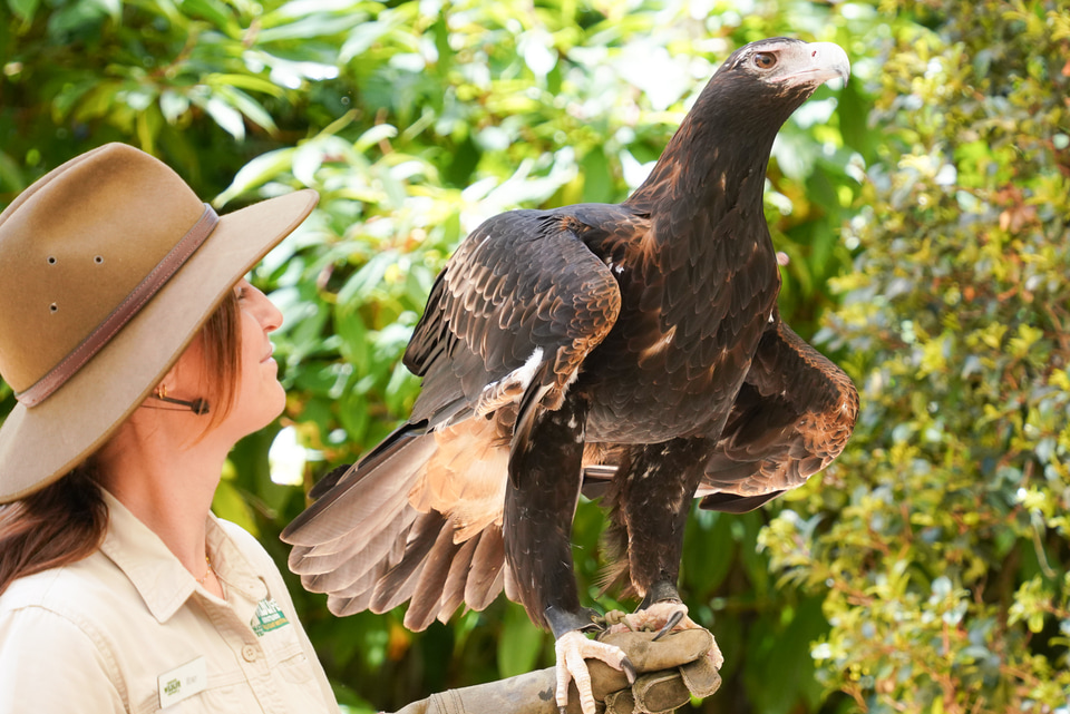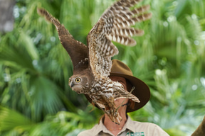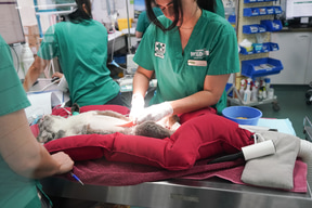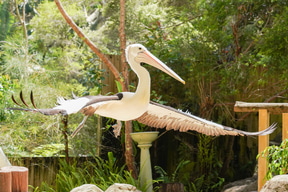 偶然、水のみにやってきたゴシキセイガイインコ。オーストラリアからニューギニア周辺に生息する 多様な鳥が飛び交う「ワイルドスカイズ・バードショー」 大型のコシグロペリカンはオーストラリアに住む唯一のペリカン 「カランビン・ワイルドライフ・サンクチュアリ」の一角には、「カランビン・ワイルドライフ・ホスピタル」という動物病院がある。オーストラリアの野生動物を治療し、リハビリを経て、最終的には野生復帰させることを目的にしている。動物病院の解説ツアーも行なわれているので、興味があれば参加してみてほしい。