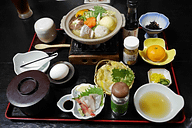 まず最初に、みかん鍋がどういったものか紹介しておきましょう。みかん鍋は、その名のとおり、みかんを使ったご当地鍋です。ただ、そのみかんの使い方に特徴があります。普通の考えでは、みかんの絞り汁を使ったたれで食べる鍋と思うかもしれませんが、周防大島みかん鍋は、鍋の具としてみかんが使われるのです。それも、皮をむいていない丸ごとのみかんを使います。鍋の具として皮ごとのみかんがごろごろ入れられているので、見た目のインパクトは非常に強烈です。