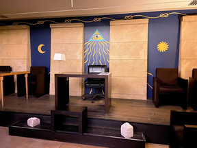 正面向かって左側が北となり、新しく入った人たちが座るのはこちら。シンボルは月と自然の状態の石です。南側にはマスターたちが座ります。こちらには太陽とカットされた石があります。石は自然な状態から磨かれた精神になったことを表わすシンボルです。太陽と月は光と影、一方が他方なしでは成り立たないという補完性を表わします。東側はグランドマスターや、会議を進行する人たちが座る場所となります。