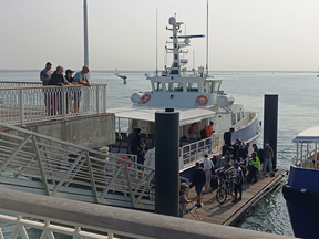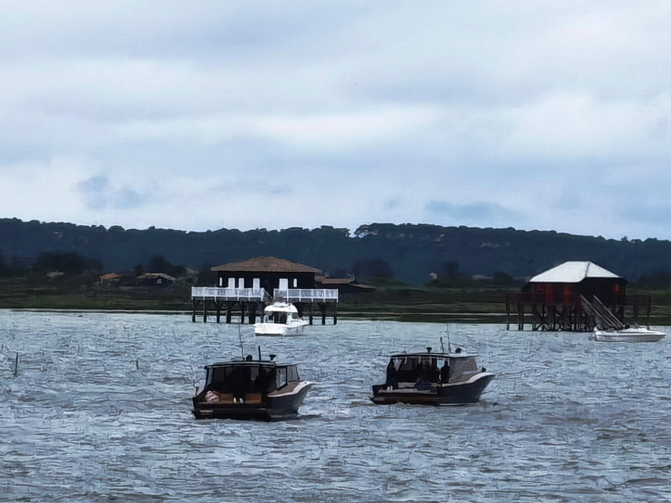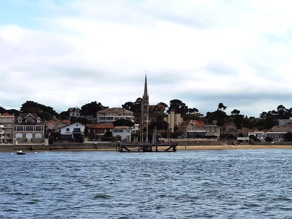 アルカションにはこの冬の町以外にも、春夏秋の名前が付いた4つのエリアがあり、現在最もにぎわっているのは海岸沿いにある「夏の町」です。夏の町からは各種観光船が運航されており、まずはアルカションの主な観光スポットを海から見ようと、2時間半の解説付きクルーズに参加しました。あとで改めて行くピラ砂丘(Dune du Pilat)やCap Ferretという半島などを眺めました。