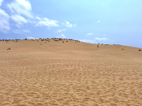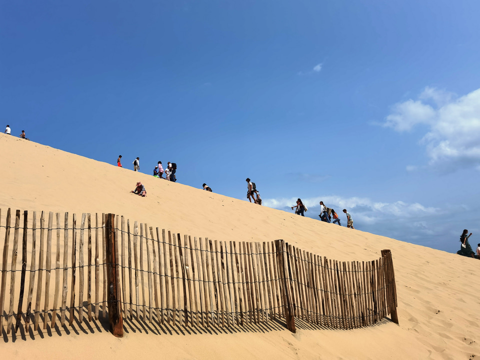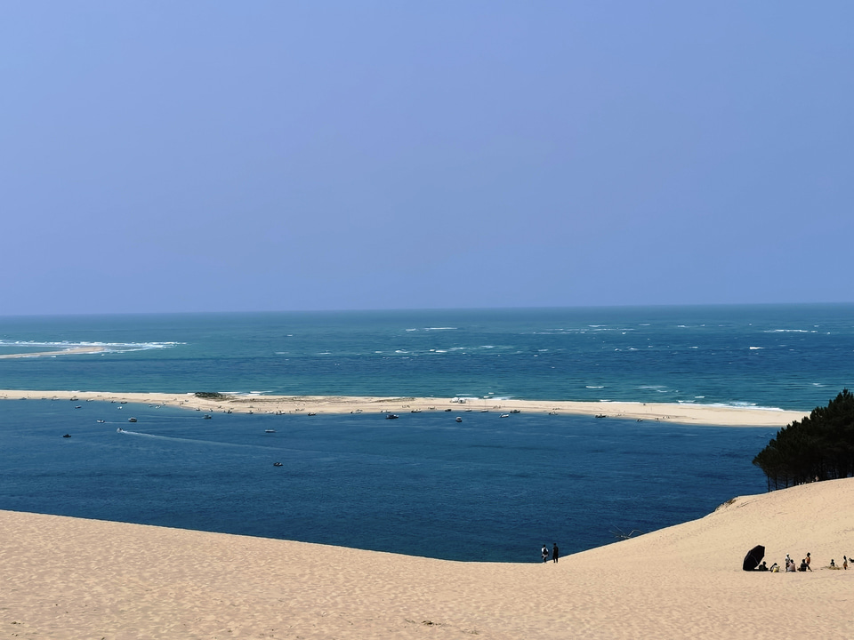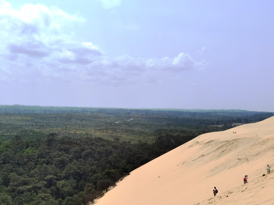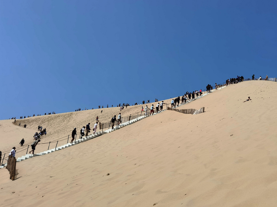 途中で石油発掘の途中で噴出したアバティーユ水源や、妊娠中の聖母マリアのめずらしい像があるノートル=ダム=デ=パス教会などを見つつ、1時間ほどで目的地のピラ砂丘に到着。高さ約100m、長さ約2.7km、幅約500mの砂丘は、圧倒的な存在感! 砂丘を上るのはちょっと大変そうだったので、私は仮設階段で上りました。それでもなかなかの運動量でしたが、上から見る景色は360度どこを見ても絶景です。