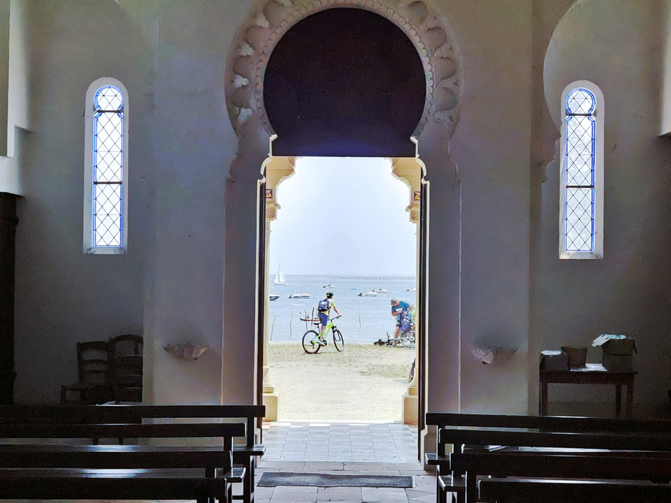 Cap Ferretは、アルカションの対岸に位置する人気の半島です。自転車ごと船で島に移動し、灯台、浜辺、牡蠣小屋などを訪ねました。半島に点在する牡蠣小屋のエリアは、カラフルな木造小屋がフォトジェニック。小屋の前では牡蠣を美味しそうに食べる人たちがいましたが、アレルギーが出るために牡蠣を食べられない私は本当に残念でした!