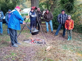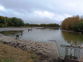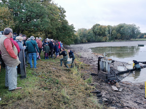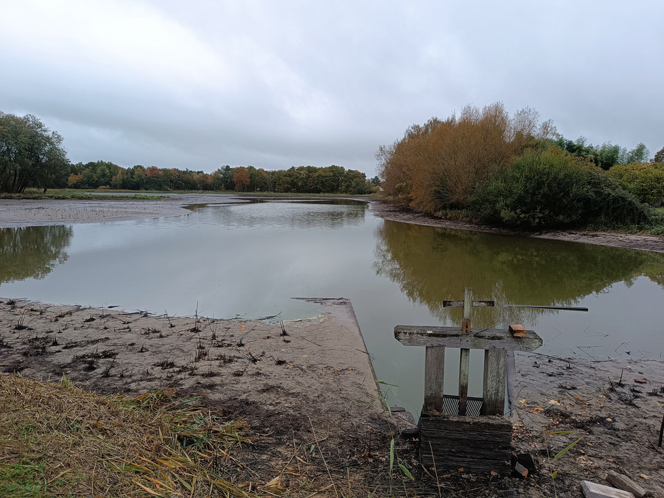 ソローニュで人工池を作って囲い込み漁が始まったのは中世のこと。現在では無形文化遺産として、秋から冬にかけて、いくつかの池で漁の様子を見ることができます。私が見学に行った池、Étang de la Villeに着いたのは朝の9時ごろでしたが、もう水止めの柵が抜かれ、水位がかなり下がっていました。池の周辺ではホットワインや手作りケーキ、ブーダンノワールという、豚の血を主な材料としたソーセージをパンにはさんだものなどが売られており、これらを飲んだり食べたり、地元の人たちは話に花を咲かせたりしながら、さらに水位が落ちるのを待ちます。