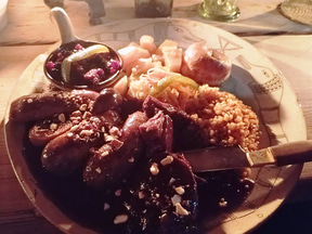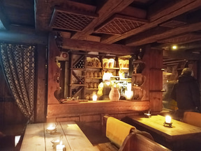 Olde Hansaは、夫のエストニア人同僚たちと行きました。中世ヨーロッパを体験できるというコンセプトのレストランで、15世紀の裕福な商人の館、という設定です。スタッフは全員中世の衣装をまとい、照明はキャンドルのみなので、とても暗いです。ジャガイモやトウモロコシといった15世紀以降の食材は使わず、クマ・シカ・イノシシなどのジビエが中心のメニューです。料理は大雑把というかワイルドというか、私の好みではないのですが、中世っぽい雰囲気を楽しむことに価値のあるレストランなので、楽しい時間を過ごしました。