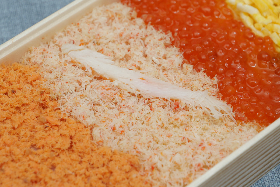 蓋を取ると、色鮮やかな海産物が目に飛び込んできます。鱒の酢〆、鮭フレーク、蟹フレークと蟹の身、イクラの醤油漬けが酢飯の上にぎっしり盛り付けられていて、その見た目だけでも贅沢さが伝わってきますし、食欲がそそられます。そして、その下に詰められている酢飯は、もちろん新潟県産のお米が使われていますから、新潟の美味しいものがギュッと詰め込まれていると言っていいでしょう。