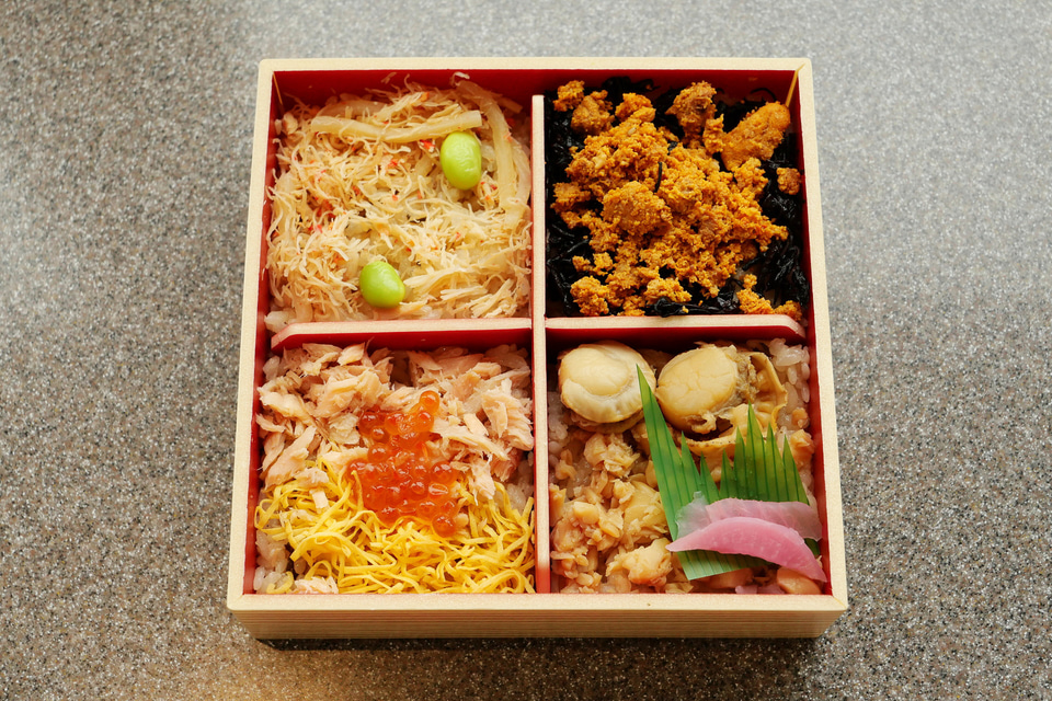 この駅弁は、その名前が示すように「かにめし」「うにめし」「鮭いくらめし」「帆立めし」と、4種類の海の幸を楽しめるのが最大の魅力です。