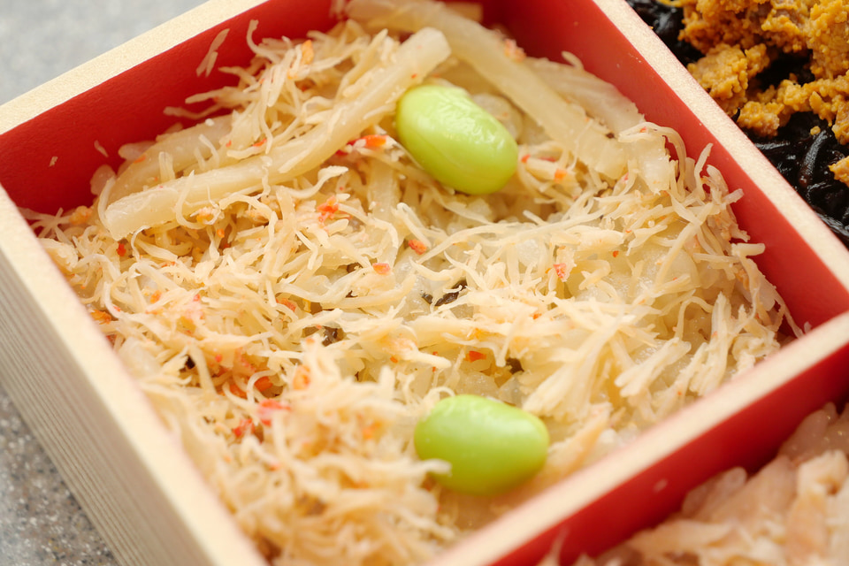 蓋を取ると、その豪華な中身が目に飛び込んできて、否が応でも期待感が高まります。かにめしには筍と一緒に煮たカニの身が、うにめしにはひじき煮の上に蒸しうにが、鮭いくらめしには鮭のそぼろとイクラの醤油漬けが、帆立めしには焼いた帆立の身がそれぞれびっしり盛り付けられています。また、それそれの下のごはんは、白飯や酢飯ではなく、昆布で炊きあげられた昆布めしとなっています。