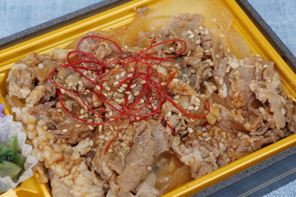 蓋を取ると、ご飯の上一面に盛り付けられた十和田バラ焼きが飛び込んできます。見た目にはすき焼き風のお肉のようですが、上に散りばめられている針唐辛子と白ごまが、すき焼きとは違うよ、とアピールしているように感じられます。
