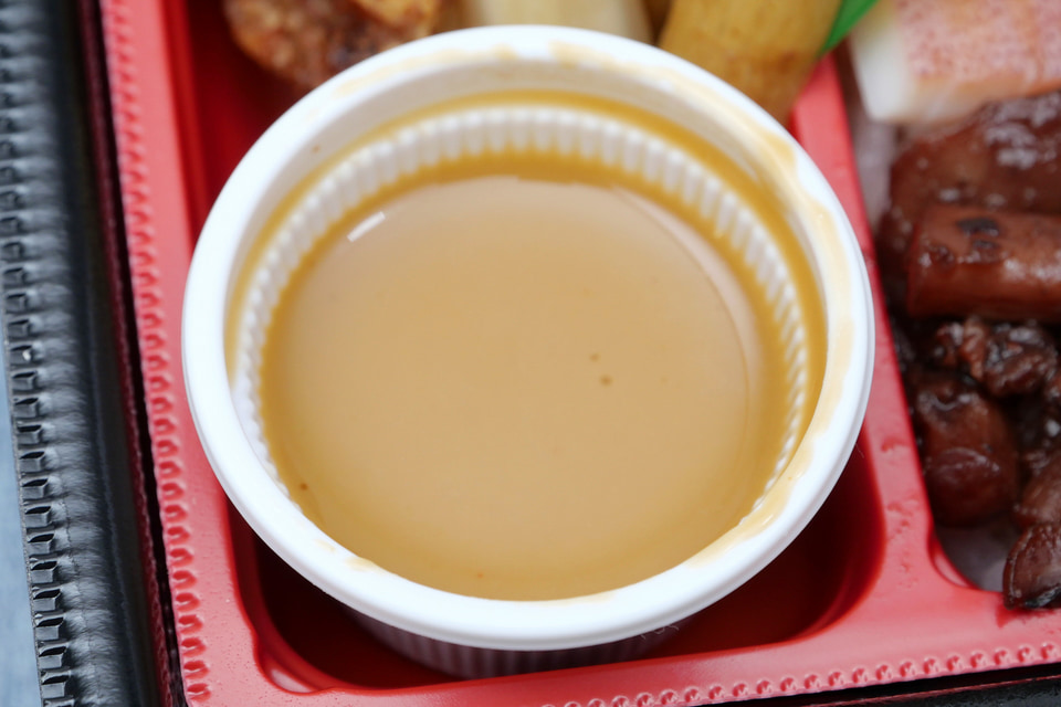 ところで、この三八弁当は、しめ鯖やイカはそのまま食べても十分美味しいのですが、お勧めの食べ方が用意されています。それは、小さな容器で別添えされている「イカのフのタレ」をかけて食べる、というものです。イカのワタをベースに作られたタレで、こちらをしめ鯖やイカにかけて食べることで、より美味しさが増すというわけです。