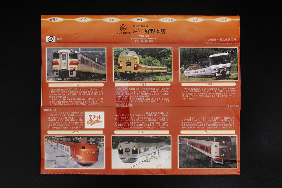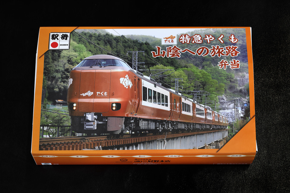2024年春、岡山駅~出雲市駅間を結ぶ特急列車「やくも」で運用されてきた381系電車が定期運行を終了し、新型273系が運行開始しました。今回紹介する「特急やくも 山陰への旅路弁当」は新型車両投入だけではなく昭和の時代から長年運行してきた車両の退役をも記念している駅弁だそうです。製造は明治24年から岡山駅で弁当販売を続ける老舗中の老舗、三好野本店です。