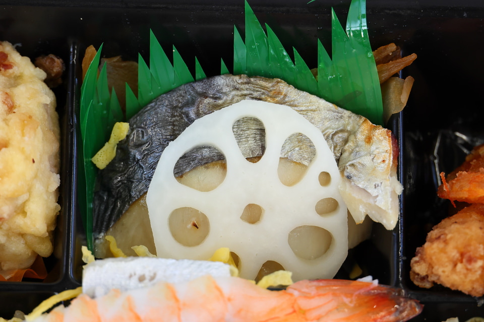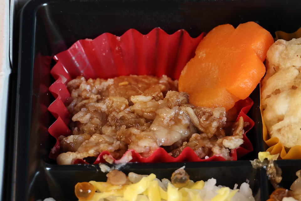 まずはおかずグループから。左上に山陰地方の郷土料理としても知られる牛肉のしぐれ煮が入っています。生姜の味よりも甘さが際立つ味付けで、量はそれほど多くはないものの食べ応えがあります。そのほかにも鰆の白醤油焼きや海老の南蛮漬け、鶏唐揚げなど牛肉、鰆、海老、鶏肉などさまざまな食材が使われています。それら海や山の幸を揚げたり焼いたり煮たりと、さまざまな調理法で仕上げていますので味、食感ともにバラエティに富んでいます。また、甘いしぐれ煮に甘さを抑えたにんじん煮が添えてあったり、焼き物にれんこんの酢漬けが乗っていたり、バランの影に甘めのゴボウ煮が隠れていたり、さまざまなアクセントが効いています。