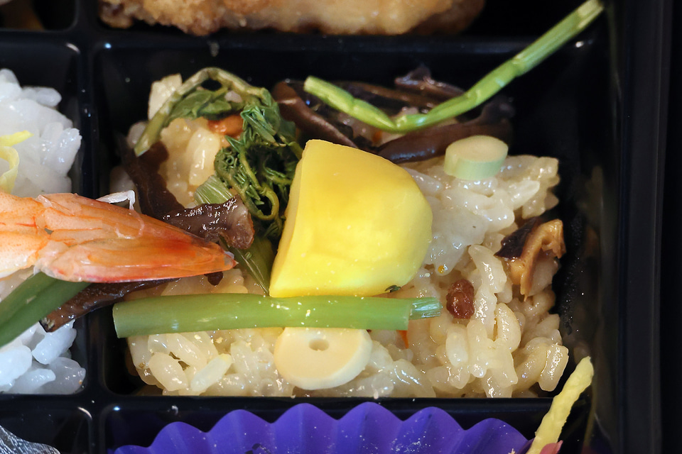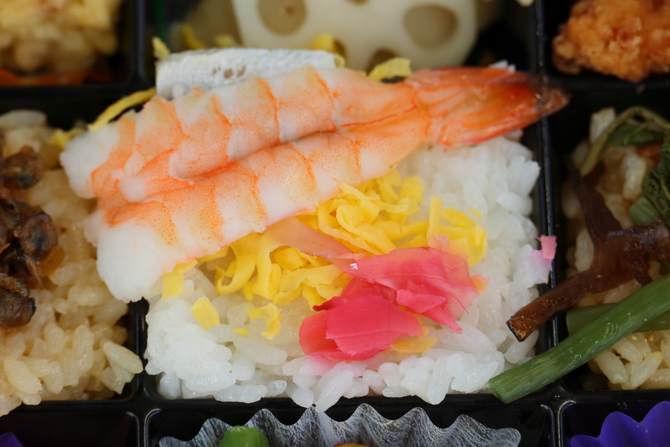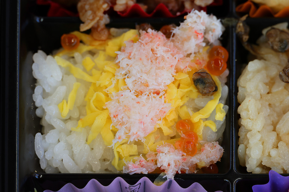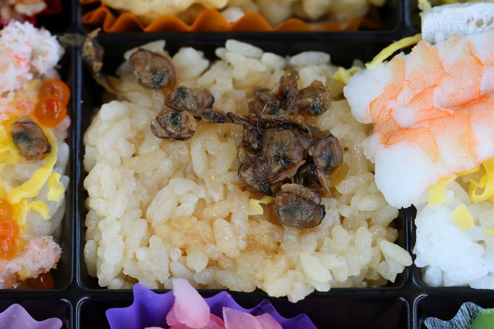 ご飯は山陰名物のかにちらし寿司、甘く煮付けたしじみが乗ったしじみごはん、岡山名物の祭ずし、もちもち食感とあっさりした味付けのおこわに甘栗の乗った蒜山(ひるぜん)おこわの4種。酢飯あり、餅米ありと味、食感ともに、おかず同様こちらも種類が多く楽しく食べられます。