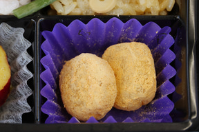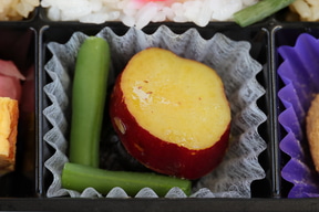付け合わせ&デザートは、油揚げが入った小松菜のおひたし+ほんのり甘い黒豆煮、玉子焼きなど。椎茸煮やいんげん塩ゆでと組み合わされるさつまいも甘露煮はかなりの甘さ。もはやデザートの領域。そしてリアルデザートには、きな粉きび団子。