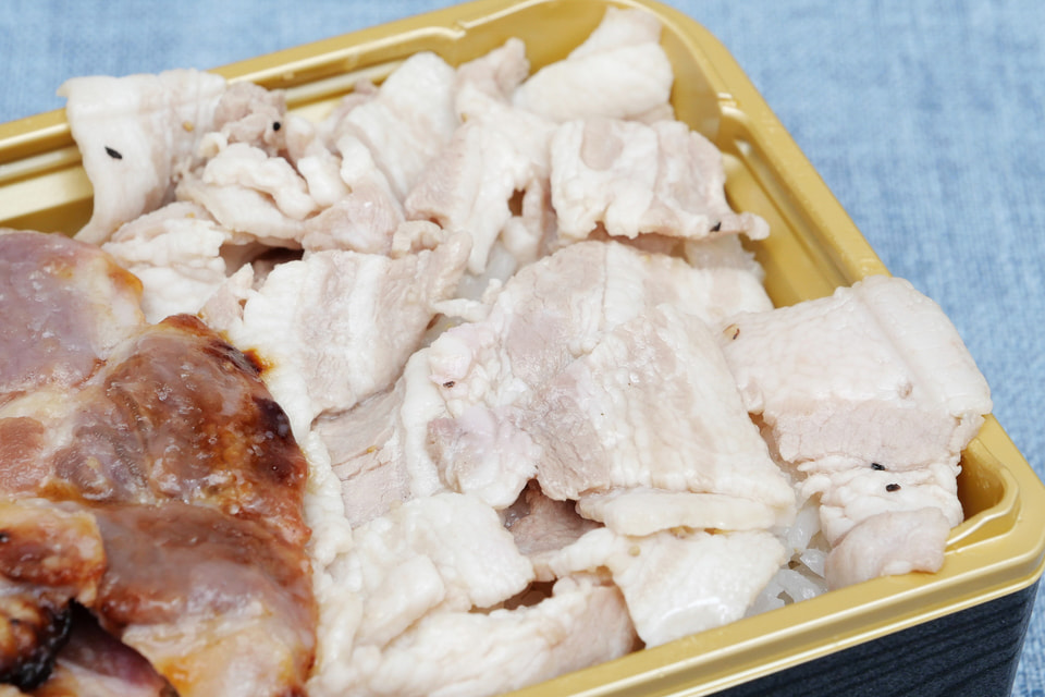 米豚のめしでは、この信州米豚を使った信州味噌焼きと塩だれ焼きが盛り付けられています。蓋を取ると、信州味噌焼きと塩だれ焼きが、下のご飯が見えないぐらいびっしりと盛り付けられています。これは肉好きにとってたまらない最強の見た目です。