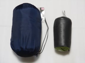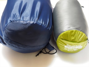 比較対象とするには酷だが、モンベル製の夏用商品と並べてみるとサイズの違いは歴然だ。ちなみに、モンベルの商品「アルパインダウンハガー800サーマルシーツ」(2万5850円、重量379g)は、夏の低山でのテント泊に最適な製品で、シュラフとシーツの中間的な特徴を持つ。