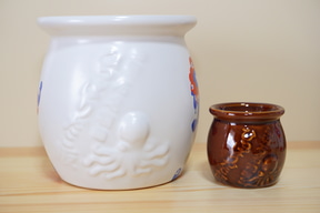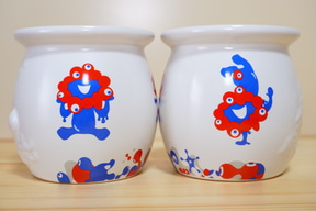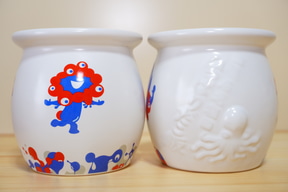 白い壺の外側には、3種類のポーズのミャクミャクや、定番商品と同じく「明石名物ひっぱりだこ飯」の文字とたこのイラストを立体的にデザイン。内側にも「ミャクミャク」の文字を印刷するなど、細部までこだわっている。
