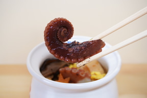 掛け紙を外してまず目に入るのは、どどーんと乗った大きなたこ旨煮 2切れ。じっくり煮込まれているのかぷりっぷりでやわらかく、噛めば噛むほどたこのやさしい甘さやうまみが口いっぱいに広がる。