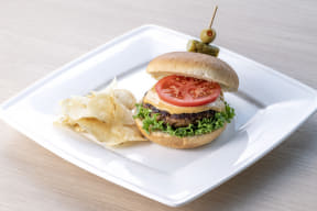 当ホテルでぜひ味わっていただきたいのが、「川岸バーガー」です。ホテルの地名から名付けられたご当地バーガーで、地元産の「北上牛」と「花巻産プラチナポーク」(白金豚)を贅沢に使用したパテ入りの絶品バーガーです。ご当地ドリンクの「北上産アップルジュース」とご一緒にお召し上がりください。
