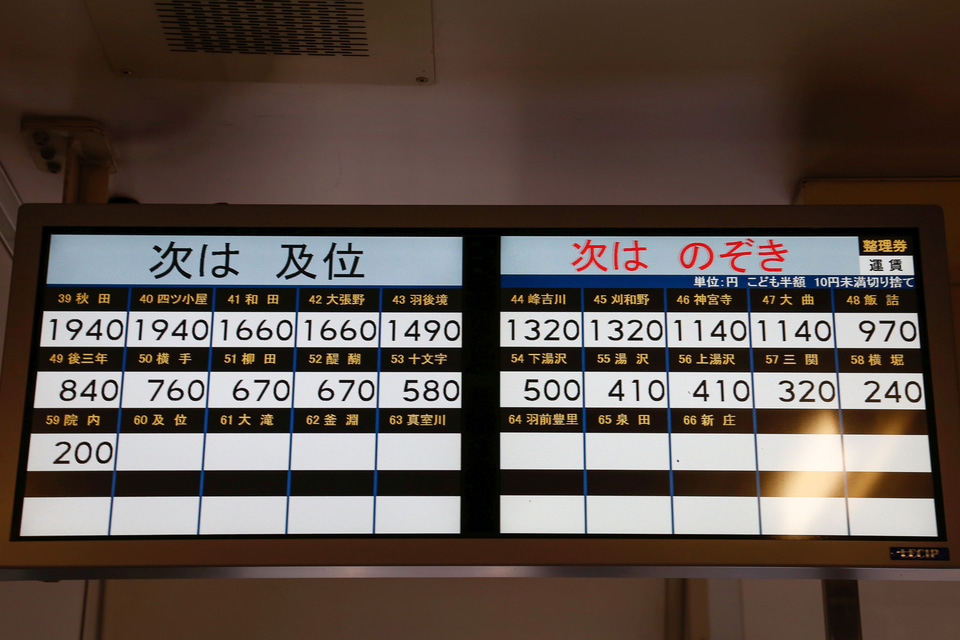 ワンマン運転の列車では、運転台の直後に運賃箱があり、その頭上に運賃表が表示されるのが通例だ。その運賃表では次駅の表示がなされるものだから、これは参考になろう。駅ごとの運賃を表示するために、駅一覧が表示されているのも便利ではある。