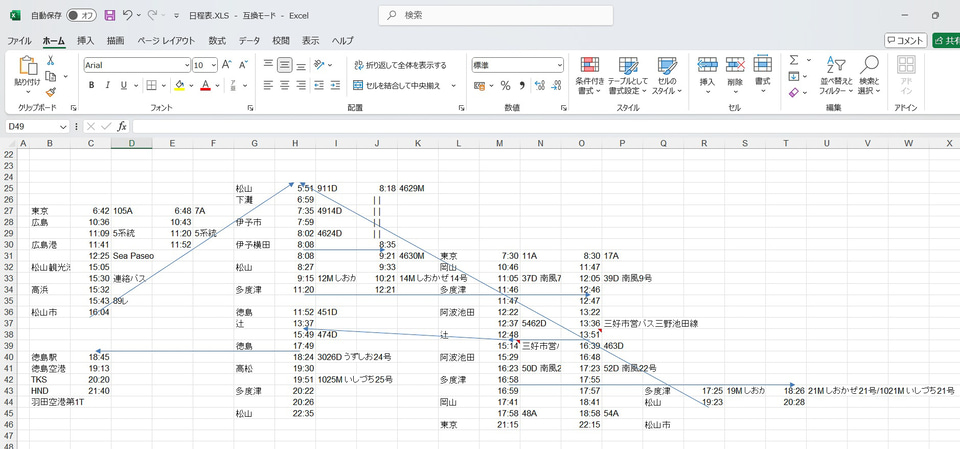そして出発後にデータを書き足すとか、予定が変わった(変わらざるを得なくなった)ときに、計画旅程とは別に実際の旅程を書き込むようなこともできる。もちろん、計画旅程を残さずに、実際の旅程を上書きしてもよい。どのみち、大元のデータはExcelブックとして手元にあるわけだから。