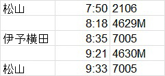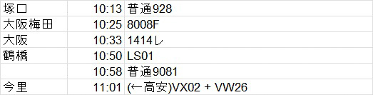 まず、発地となる駅と着地となる駅、その途上で乗り換えを行った駅、これらが縦に並び、その横に着発時刻の情報が入る。ただしそれだけだと「どんな列車に乗ったのか」が分からないので、筆者は列車番号も記録している。
