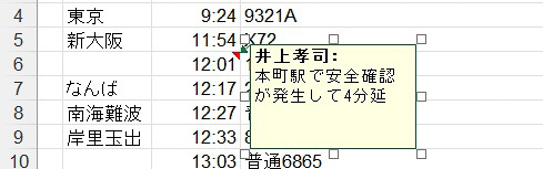 筆者の場合、最終的には計画立案に使ったExcelブックにOneNoteから転記して最終保存用データとしている。その際に、遅延に関する情報は、セルごとの「メモ」として記入している。発車が遅れたときには、当該列車の発時刻のセルに、到着が遅れたときには当該列車の着時刻のセルに、メモとして「こういう理由でこれだけ遅れた」と書いておく。
