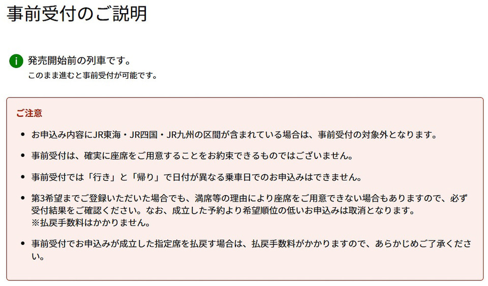 ところが、この事前受付・事前申込には若干の制約が生じる場合がある。その分かりやすい事例が「えきねっと」で、JR東海・JR四国・JR九州の区間が含まれる申し込みでは、事前受付ができない。よって、東海道新幹線はすべて対象外である。