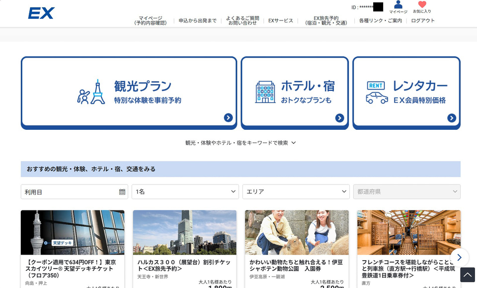 「EXサービス」の特徴として、「EX旅パック」とは別に「EX旅先予約」というメニューがあり、行った先で利用する宿泊、観光、交通などの商品を購入できる点が挙げられる。往復の足となる東海道・山陽・九州新幹線の列車をEXサービス経由で購入する前提で、その先についてもめんどうを見ましょうという位置付けだ。