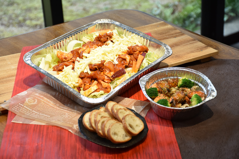 食材は併設レストランのシェフがすべてカットし、アルミ製の容器に入った食材を火にかけるだけで完成します。
