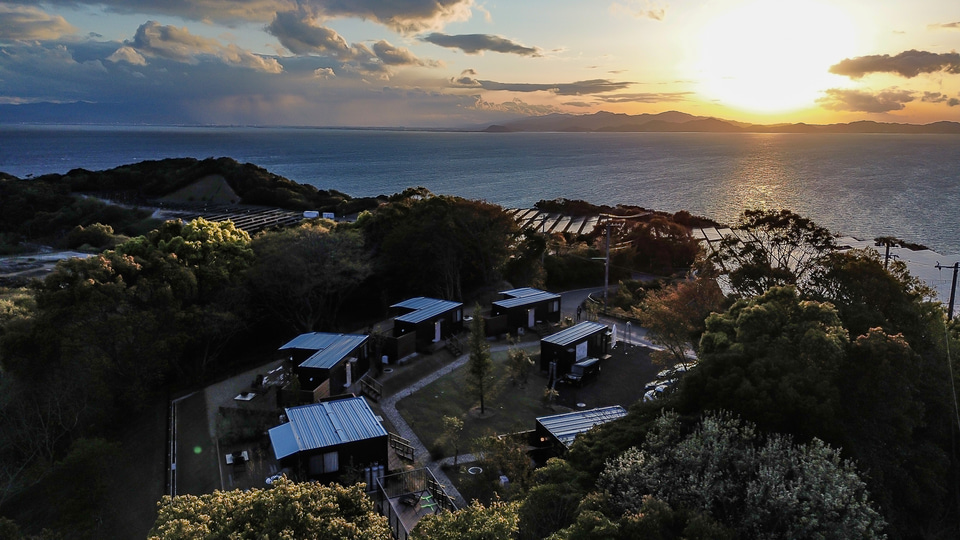 淡路島の最南端南あわじ阿万に位置し、施設内に5棟と人ごみの窮屈さを感じることなく、大自然を満喫することができるコテージホテル。山の木々が目の前にあり、ガラス越しに星空を見ながらのサウナは贅沢なひとときです。お部屋内にあるHUGGING NATURE HOUSEオリジナルデザインのアメニティポーチも特別感があります。淡路島の食にこだわった朝食は色合いがよく、すてきなひと時を過ごしていただけます。