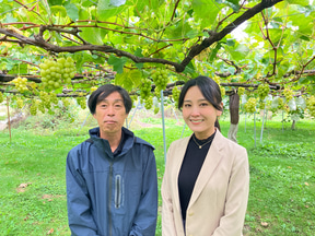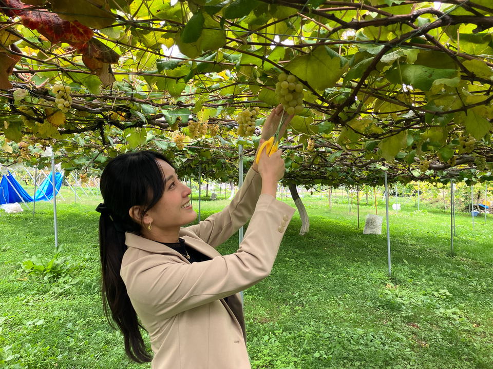 生産者さまにご指導をいただきながら、実際にシャインマスカットを収穫させていただきました。