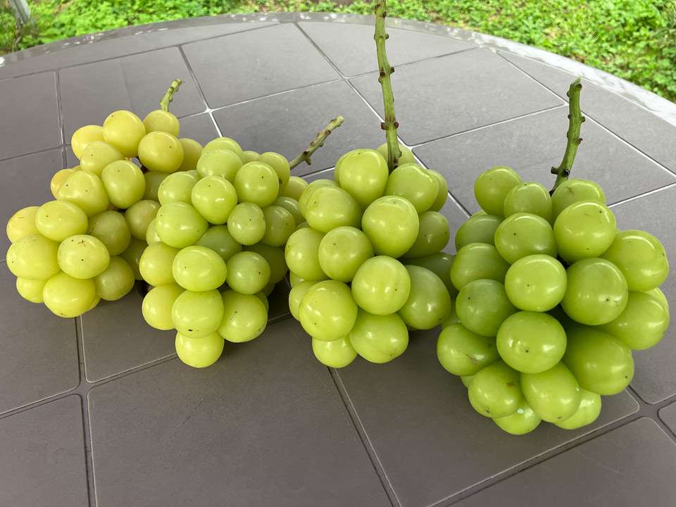 伊那は昼夜の寒暖差が大きく、これが糖度の高いぶどうを育てるのに非常に適しており、甘味が強く、豊かな芳香とジューシーな食感が特徴だそうです。同じシャインマスカットでも、色がこんなにも違い、甘さや酸味の度合いも違います!(下記写真)