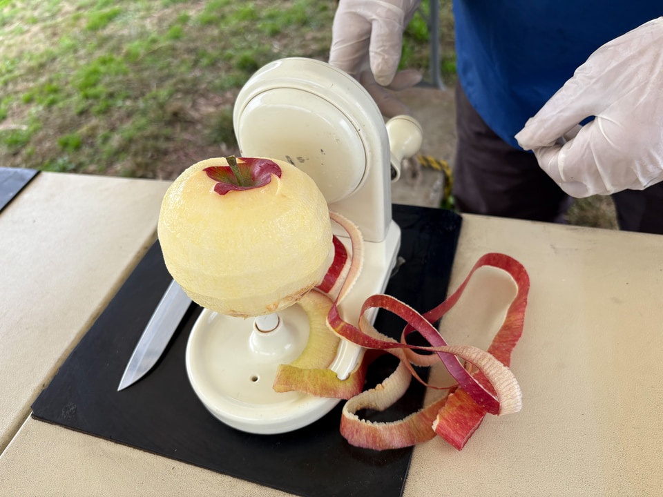 生産者さまが使用していたこちらの皮むき器! するするりんごの皮がむけていき、あっという間に蜜たっぷりの中身があらわになりました。