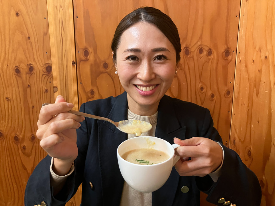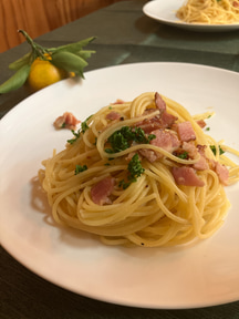次にご紹介するのは、オイルパスタです。ベーコンの香ばしさとパスタの上にレモンの皮をトッピング。レモンの爽やかな風味が口のなかに広がり、ベーコンとのコントラストが最高です。柿のポタージュと一緒にいただきました。