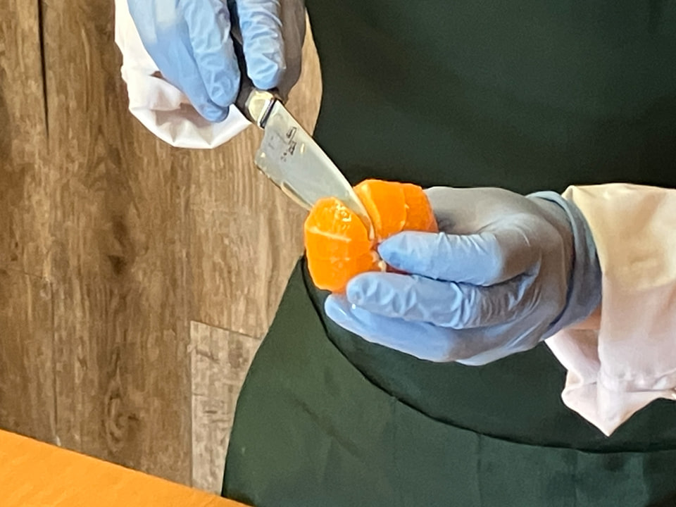 コース内では、フルーツの飾り切り体験ができます。ちょっと飾り切りができると料理がパッと華やかになります。「難しいのでは?」と感じるかもしれませんが専門スタッフが丁寧に教えてくれるので大丈夫です! 1つ完成すると「次はもっと難しいのに挑戦してみたい!」とハマってしまう楽しさでした。お子さまと一緒に挑戦してみたり、フルーツを通じて食育も学ぶことができます。