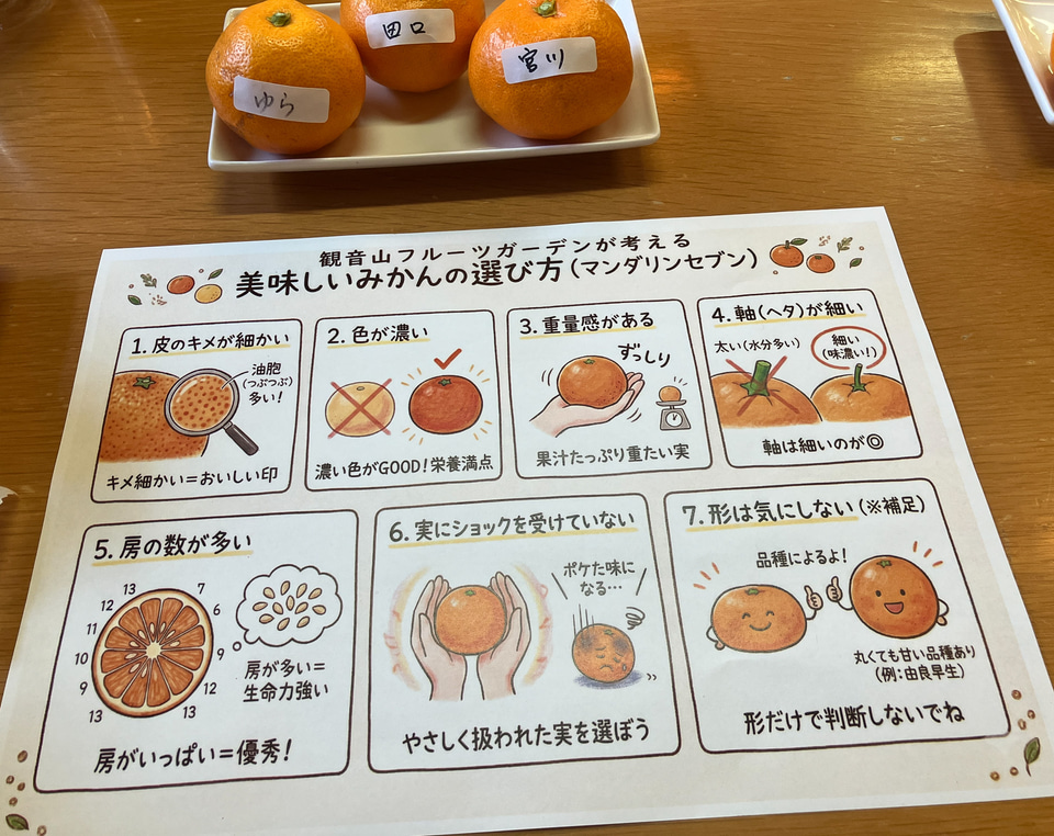 スーパーでは袋詰めでの販売のため、一つ一つを手に取って選ぶことができませんが、みかんの皮のきめが細かく、色の濃いものを選ぶと美味しいみかんを選ぶことができると教えていただきました。