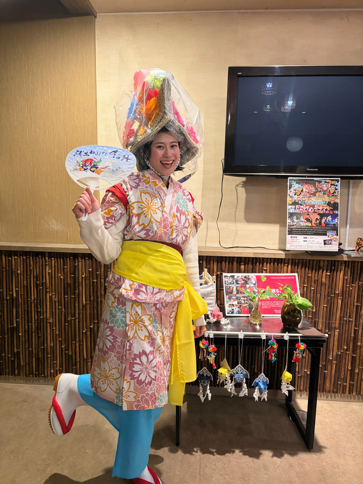 私は、青森で跳人を体験するのが夢だったので、早速着付けをしていただき、いざ祭りへ出陣しました。
