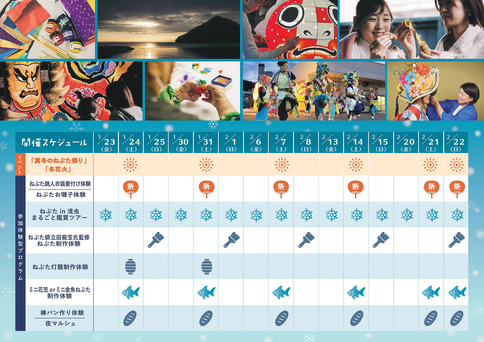 ねぶた運行: 期間中の毎週土曜(1月24日/31日、2月7日/14日/21日)と最終日(2月22日)の夕方