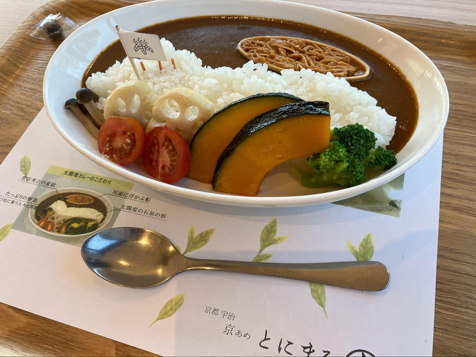 体験のあとは、施設内のカフェ「とにまる」で一休み。窓の外に広がる茶畑の緑に包まれながら、爽やかな気持ちでお食事を楽しむことができます。お店の方のお勧めは、太閤堤カレーとわたあめバームです!