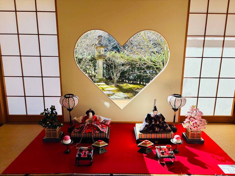 宇治田原町にある「正寿院」には、お寺のあらゆるところにハート形の猪目があり、魔除けや福を招くと言われています。猪目の窓からは、四季折々の美しい景色を楽しむことができます。春の桜の季節にはピンクのハートに、夏は新緑で鮮やかなグリーンに、秋の紅葉では真っ赤に染まり、冬は雪で白一色に包まれます。