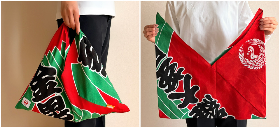「より快適に観劇していただきたい」そんな想いから、JALは琴平町へ来場者用のひざ掛けを寄贈しました。座紋「佐伯鶴の丸」とJALの「鶴丸」、二つの鶴のご縁をあしらったデザインです。