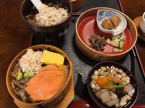 そしておそばは、つるつるの麺に辛味の効いたネギをかじりながらいただくスタイルで、ネギ好きの私には大ヒット。家でもこうやって食べたいくらいです。旦那さんの方はよくばり輪箱飯ということで、私の五種の具材に加えてイクラ、磐梯細竹が足された豪華なもので、少し具材を分けてもらいながら味見しました。