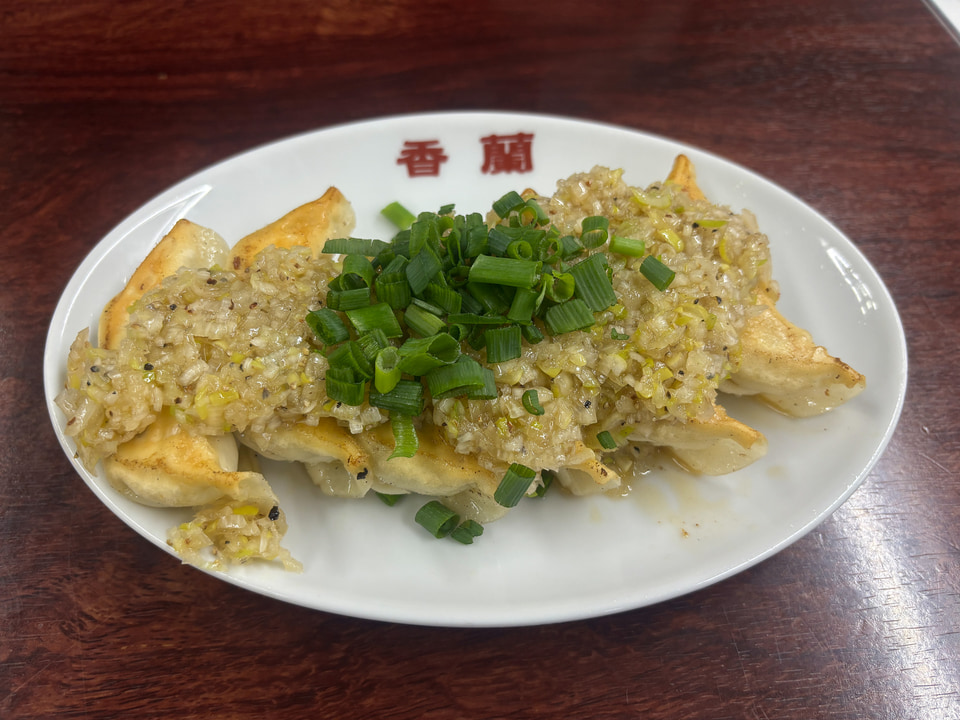 まずは香蘭のネギ塩餃子が到着。焼き餃子にたっぷりのネギ塩ダレがかかっていて、パリッとした食感としっとりしたネギの食感がクセになります。少し味濃いめの味付けのネギ塩ダレだったので、ビールが欲しくなってしまいました。
