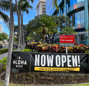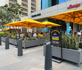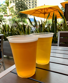 まずは、1人20ドルで楽しめるハッピーアワーを。ワイキキのメイン通り、カラカウア通りを歩いているとひときわ目を引く黄色いパラソルが目印となる「アロハビアカンパニー」。これまでハワイにありそうでなかったビアガーデンで、今年(2022年)4月のグランドオープン以来、「ハワイのクラフトビールを気軽に味わえる」と賑わっている。