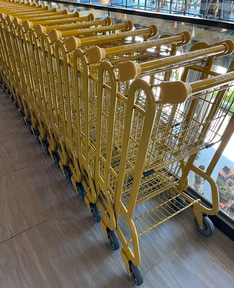 入り口の手前には、スタイリッシュなゴールドのショッピングカートが並ぶ。