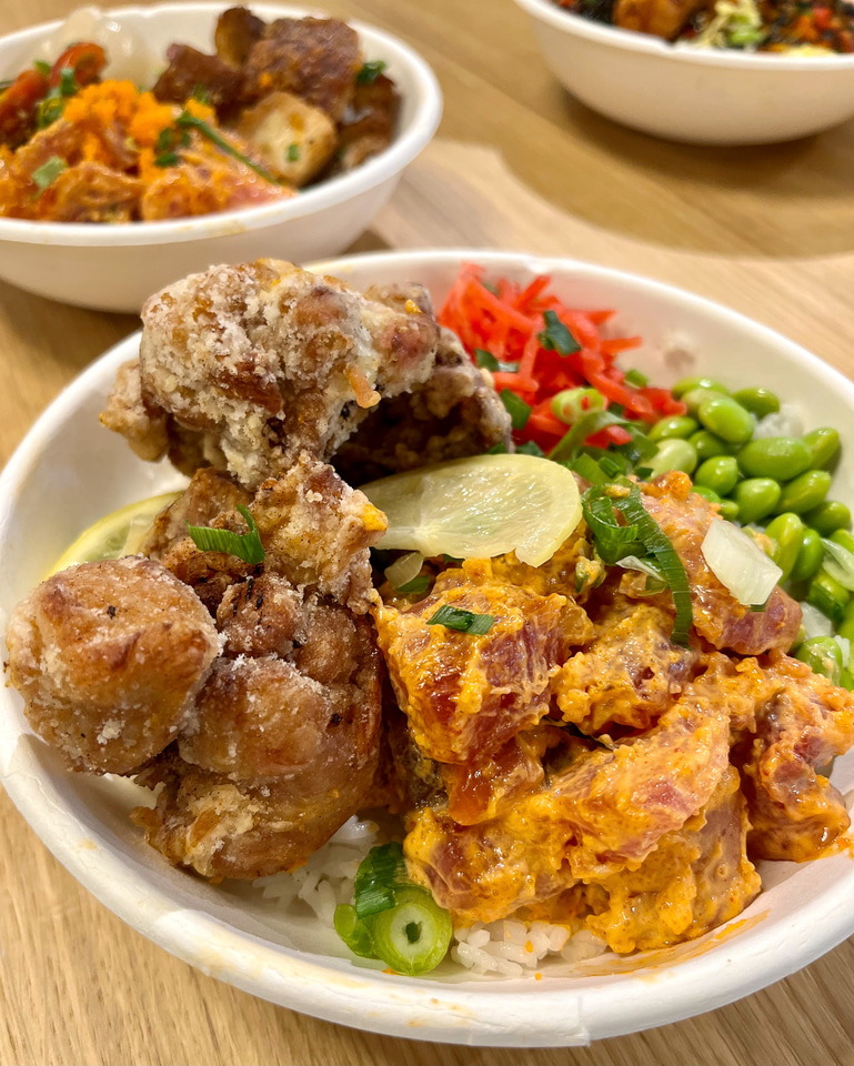 ポケとローストポークの上にロミサーモンを乗せ、ガーリックのピクルスとネギをトッピングした「サーフ&ターフ」などの丼のほか、ポケ、サイド、ソース、トッピングを選んでカスタムメイドのポケボウルを作ることができる。
