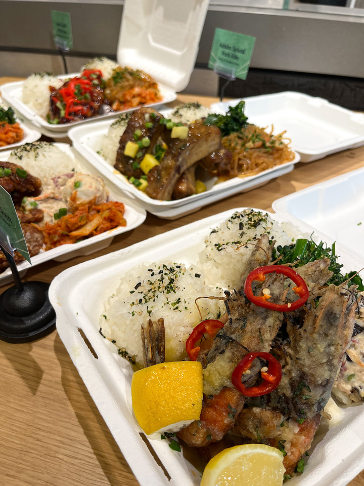 アドボ味のポークリブ、ガーリックサンバルソース味のフライドチキン、スモークドアヒ・ポテトサラダ、本日の魚の味噌焼き、きゅうりとチョイサムのナムル、など、まさに各国の料理をミックスしたハワイの味を日替わりで満喫できる。