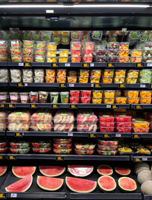 パパイヤなどトロピカルフルーツや野菜のコーナーも充実している。すぐに食べられるカットフルーツの種類も多い。